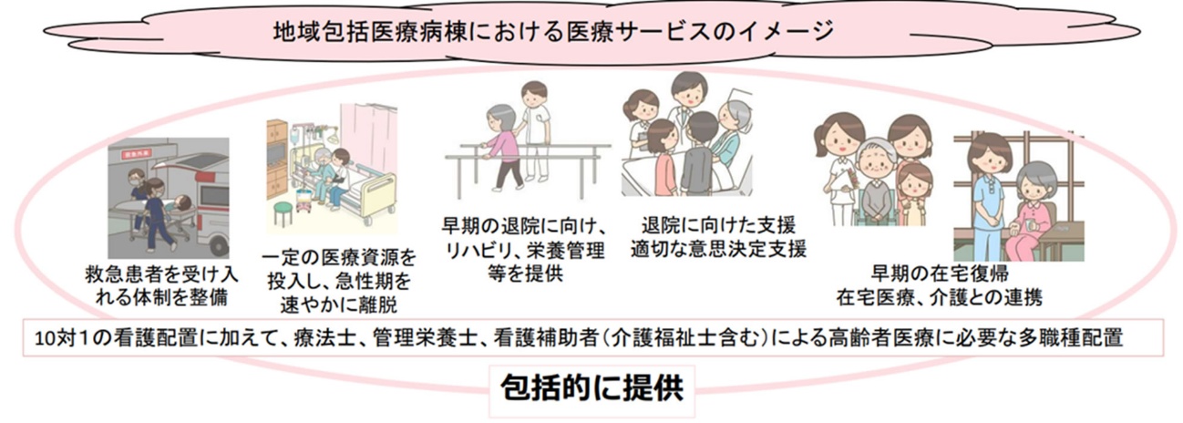 当院では地域の高齢者医療ニーズに対応するため、「地域包括医療病棟」を開設いたしました。今後ますます増加が見込まれる高齢者の救急医療に柔軟に対応するための病棟であり、軽症・中等症の高齢患者さんを中心に受け入れ、在宅復帰を目標とした医療を提供しています。
